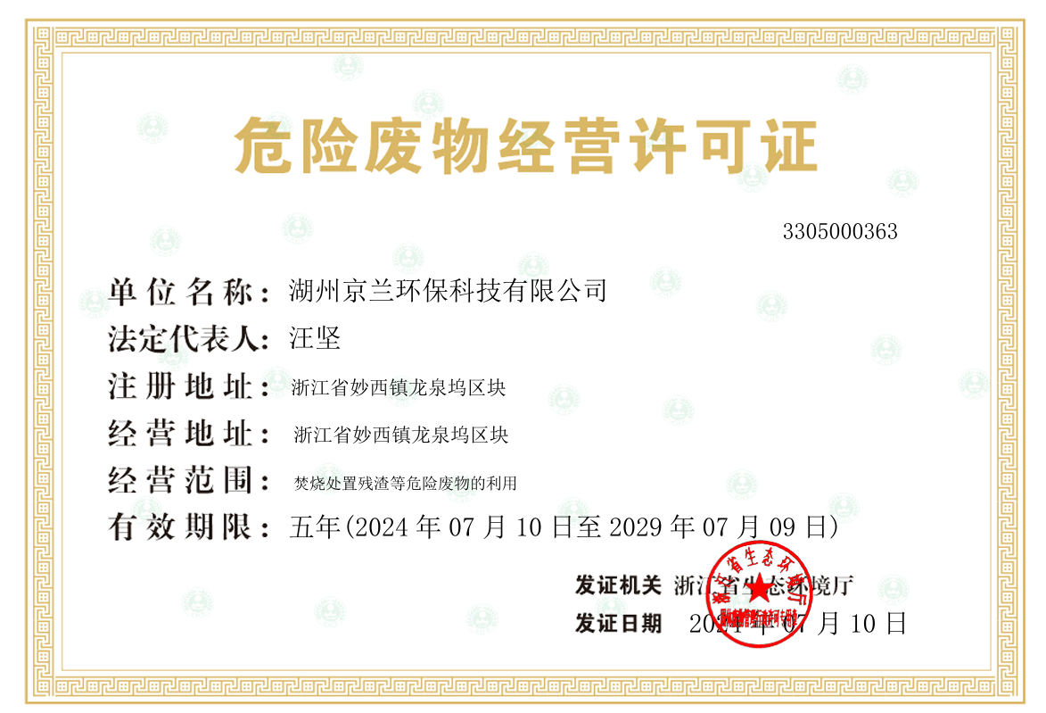 喜報(bào)!湖州京蘭環(huán)保順利完成危險(xiǎn)廢物五年期經(jīng)營(yíng)許可證換證工作