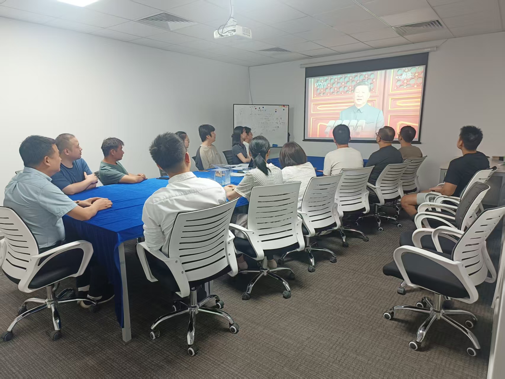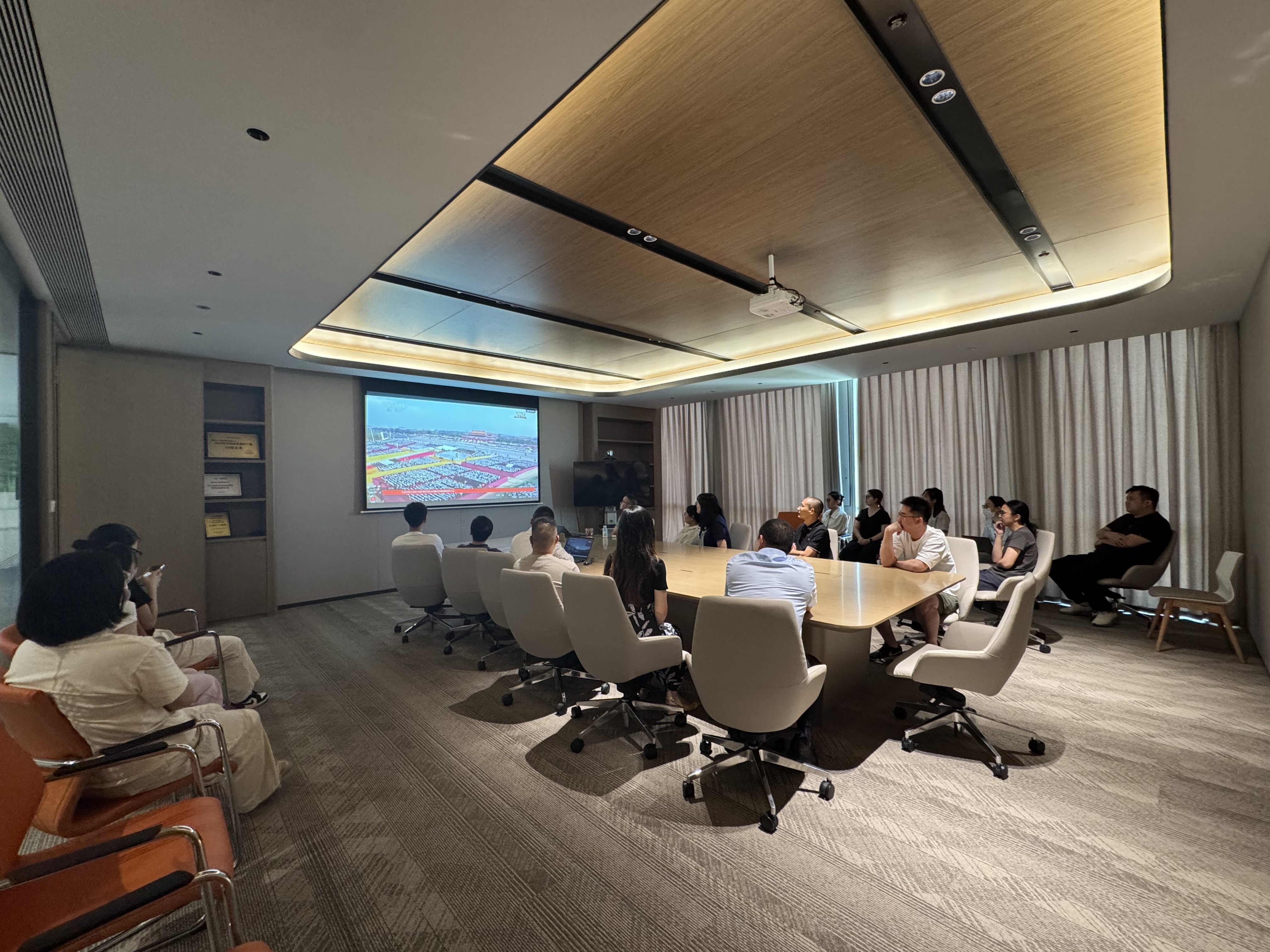 上午9時,大家準(zhǔn)時聚集在各公司的會議室,自發(fā)整理好衣襟,眼神中滿是期待與肅穆。當(dāng)直播畫面切到天安門廣場,鮮艷的五星紅旗在晨光中冉冉升起,激昂的歌聲里,是跨越代際的信仰傳承,是屬于京蘭人的集體共鳴。?